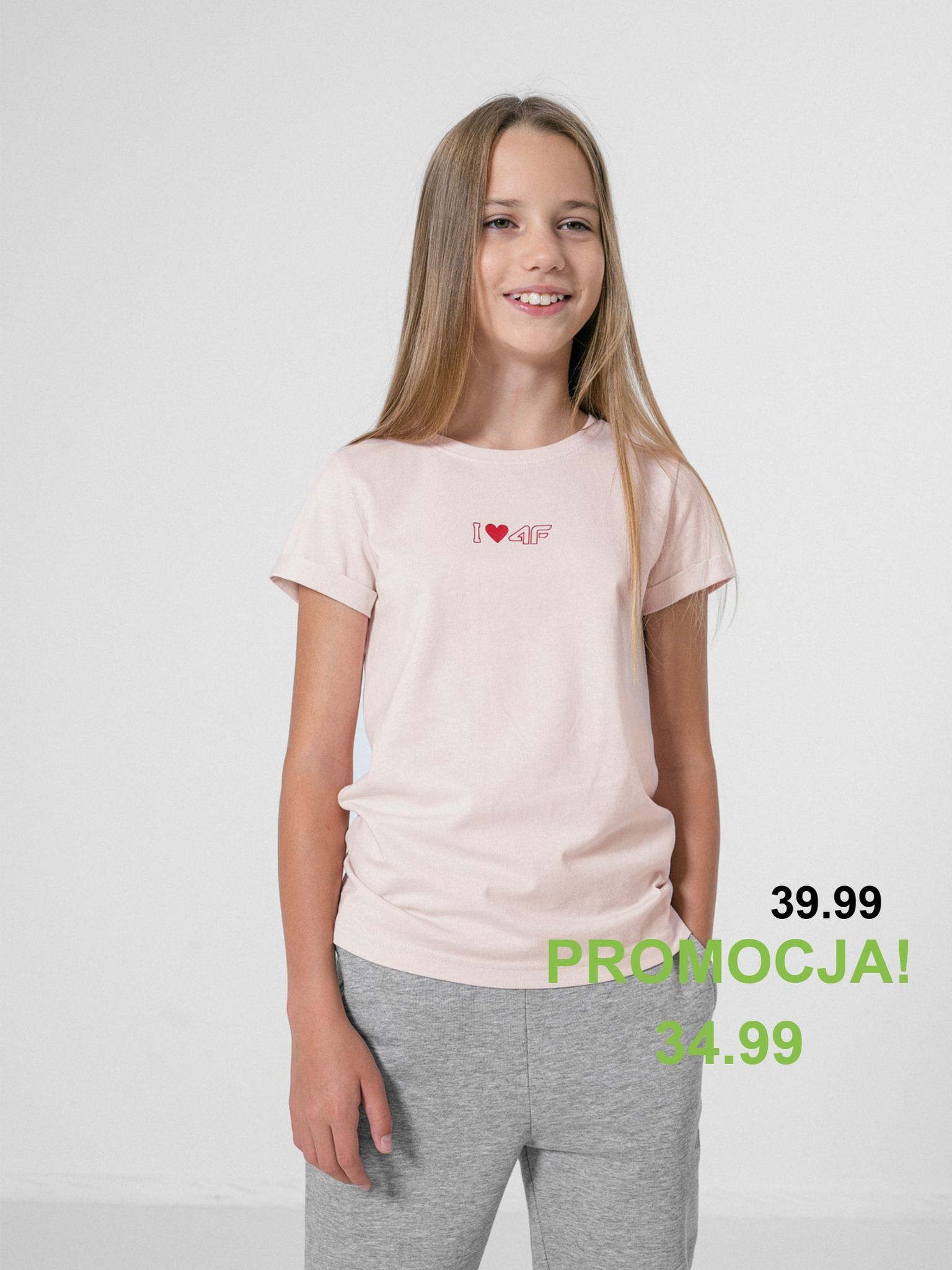 Klasyczny, bawełniany t-shirt dziewczęcy 4F. To świetna propozycja na każdą okazję i każdą porę roku. Koszulka idealnie pasuje do dżinsów, dresów pod bluzę w chłodniejsze dni. Miły i przyjemny materiał nie obciera i nie ogranicza ruchów.
